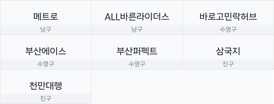 이츠플러스 주요협력사 2025 10 부산광역시 강서/사하구 금정/동래/북구 남구/수영/진구 해운대구 유의사항 – 해당 협력사 정보는 원활한 이츠플러스 운영 지원 목적으로 협력사 대표님의 요청에 따라 게시되었습니다. 쿠팡이츠플러스 관련 문의 목적으로만 사용해 주시기 바랍니다. – 주요협력사는 위탁 업무 수행 결과에 따라 내부적인 기준으로 선정하며, 캠페인 운영, 혜택 등은 운영상황에 따라 변경될 수 있습니다. – 부적절한 사례가 발견될 경우 사전 고지 후 주요협력사에서 제외 될 수 있습니다.