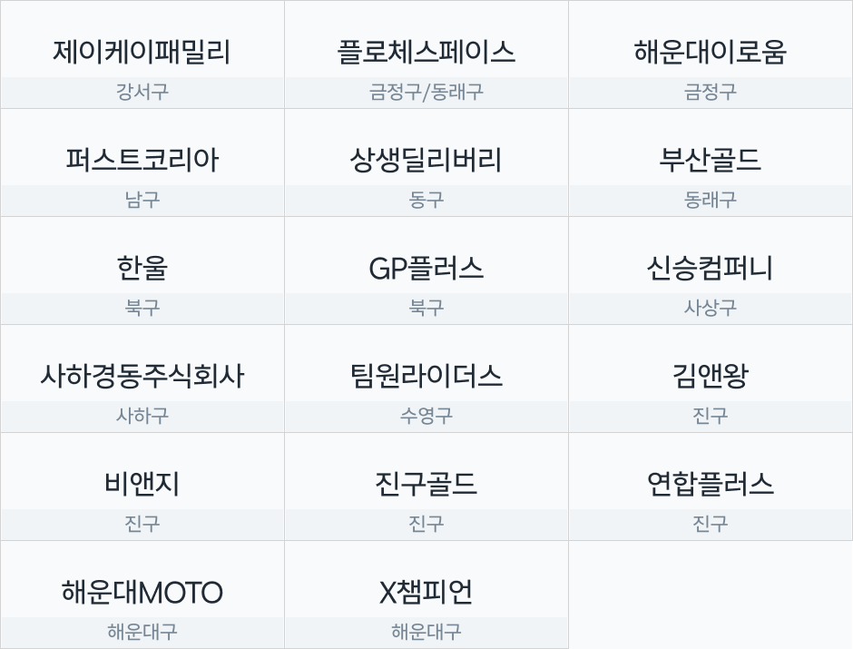 부산 유의사항 – 해당 협력사 정보는 원활한 이츠플러스 운영 지원 목적으로 협력사 대표님의 요청에 따라 게시되었습니다. 쿠팡이츠플러스 관련 문의 목적으로만 사용해 주시기 바랍니다. – 주요협력사는 위탁 업무 수행 결과에 따라 내부적인 기준으로 선정하며, 캠페인 운영, 혜택 등은 운영상황에 따라 변경될 수 있습니다. – 부적절한 사례가 발견될 경우 사전 고지 후 주요협력사에서 제외 될 수 있습니다.