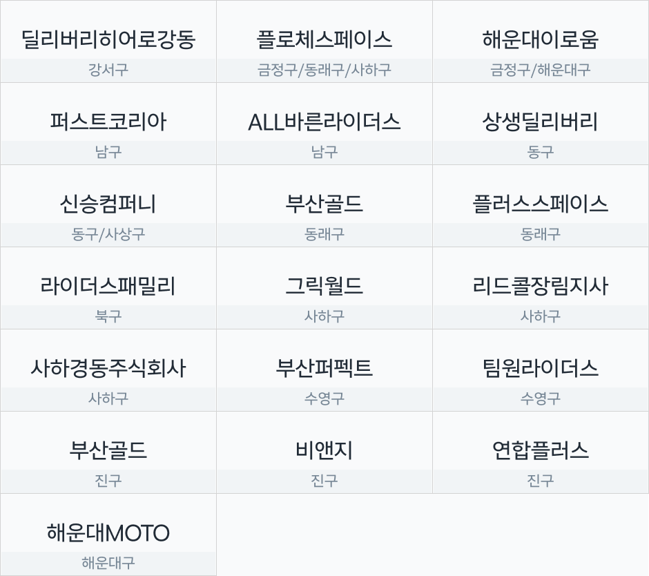 부산 유의사항 – 해당 협력사 정보는 원활한 이츠플러스 운영 지원 목적으로 협력사 대표님의 요청에 따라 게시되었습니다. 쿠팡이츠플러스 관련 문의 목적으로만 사용해 주시기 바랍니다. – 주요협력사는 위탁 업무 수행 결과에 따라 내부적인 기준으로 선정하며, 캠페인 운영, 혜택 등은 운영상황에 따라 변경될 수 있습니다. – 부적절한 사례가 발견될 경우 사전 고지 후 주요협력사에서 제외 될 수 있습니다.