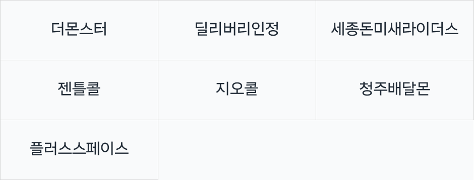 청주 제천/충주 유의사항 – 해당 협력사 정보는 원활한 이츠플러스 운영 지원 목적으로 협력사 대표님의 요청에 따라 게시되었습니다. 쿠팡이츠플러스 관련 문의 목적으로만 사용해 주시기 바랍니다. – 주요협력사는 위탁 업무 수행 결과에 따라 내부적인 기준으로 선정하며, 캠페인 운영, 혜택 등은 운영상황에 따라 변경될 수 있습니다. – 부적절한 사례가 발견될 경우 사전 고지 후 주요협력사에서 제외 될 수 있습니다.