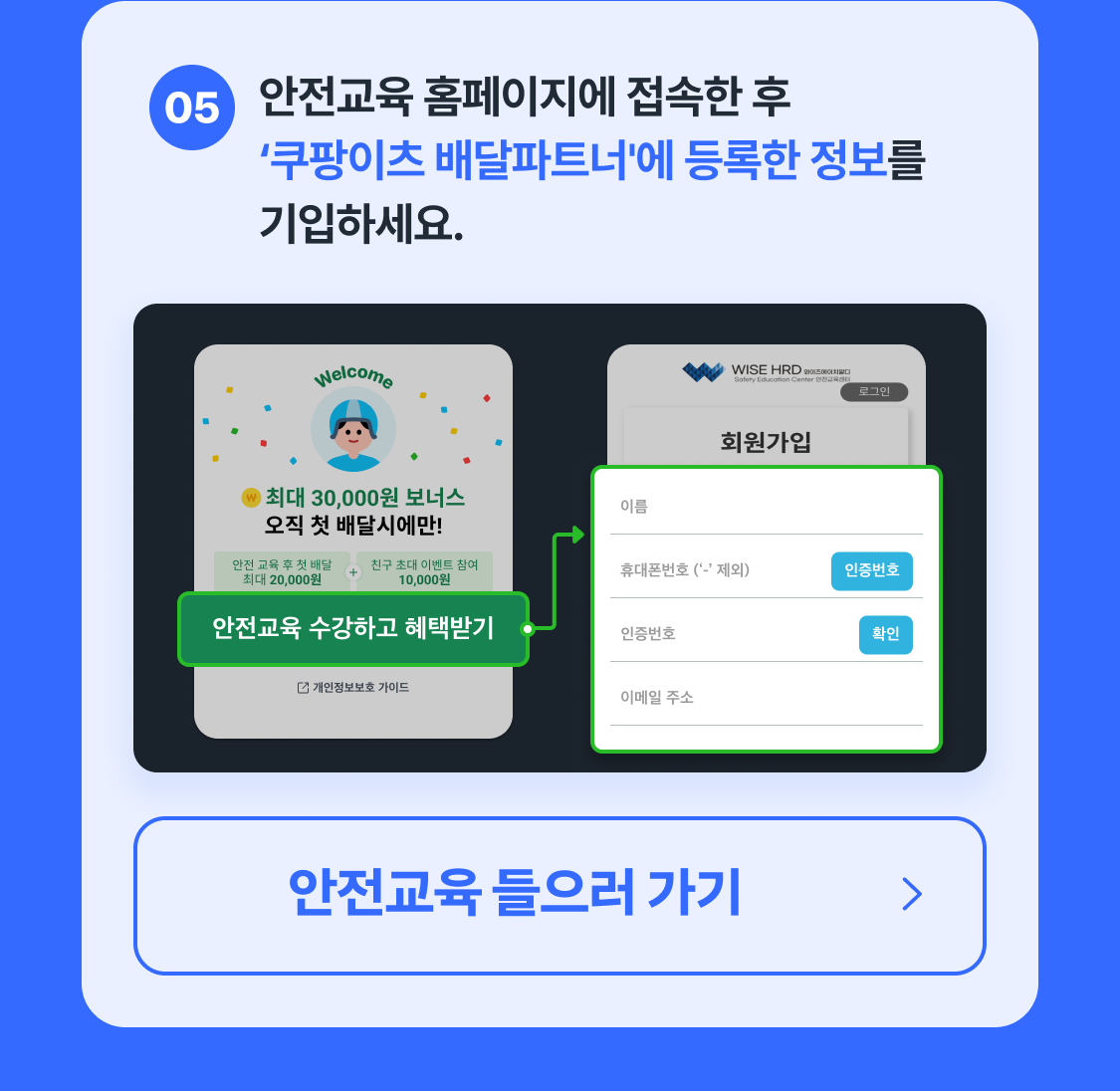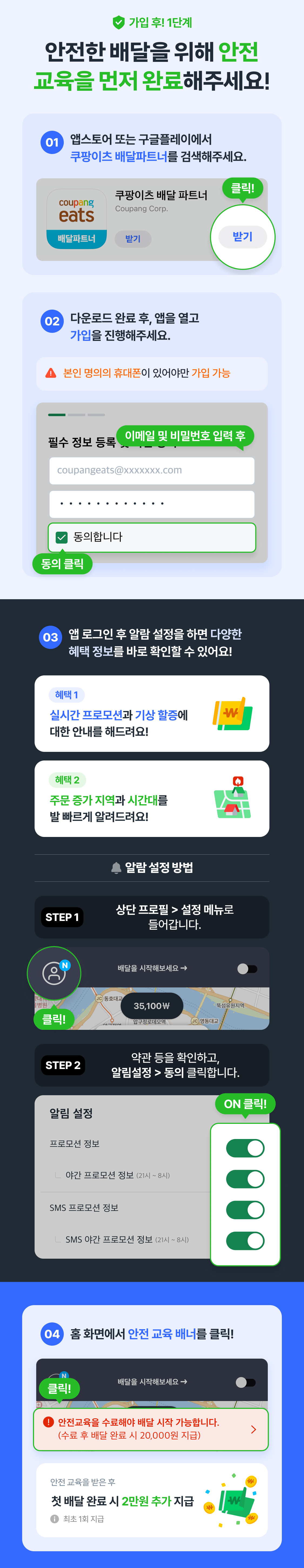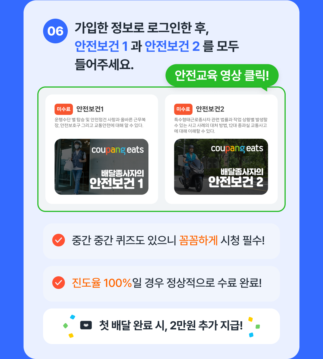 쉽게 배달할 수 있는 방법 총 정리! 첫 배달 가이드 첫 배달 2만원 보너스 받기 카카오톡으로 더 많은 정보 받기 쉽게 배달할 수 있는 방법 총 정리! 첫 배달 가이드 첫 배달 2만원 보너스 받기 카카오톡으로 더 많은 정보 받기 첫배달가이드 많이 묻는질문 개인정보보호가이드 01 안전교육02 배달방법03 수입확인04 친구초대 다음 단계로 넘어가기! 쿠팡이츠 배달파트너 채널 추가 친구 초대 보너스 받기 개인 정보 보호 가이드 보러가기 개인정보보호 가이드 보러가기